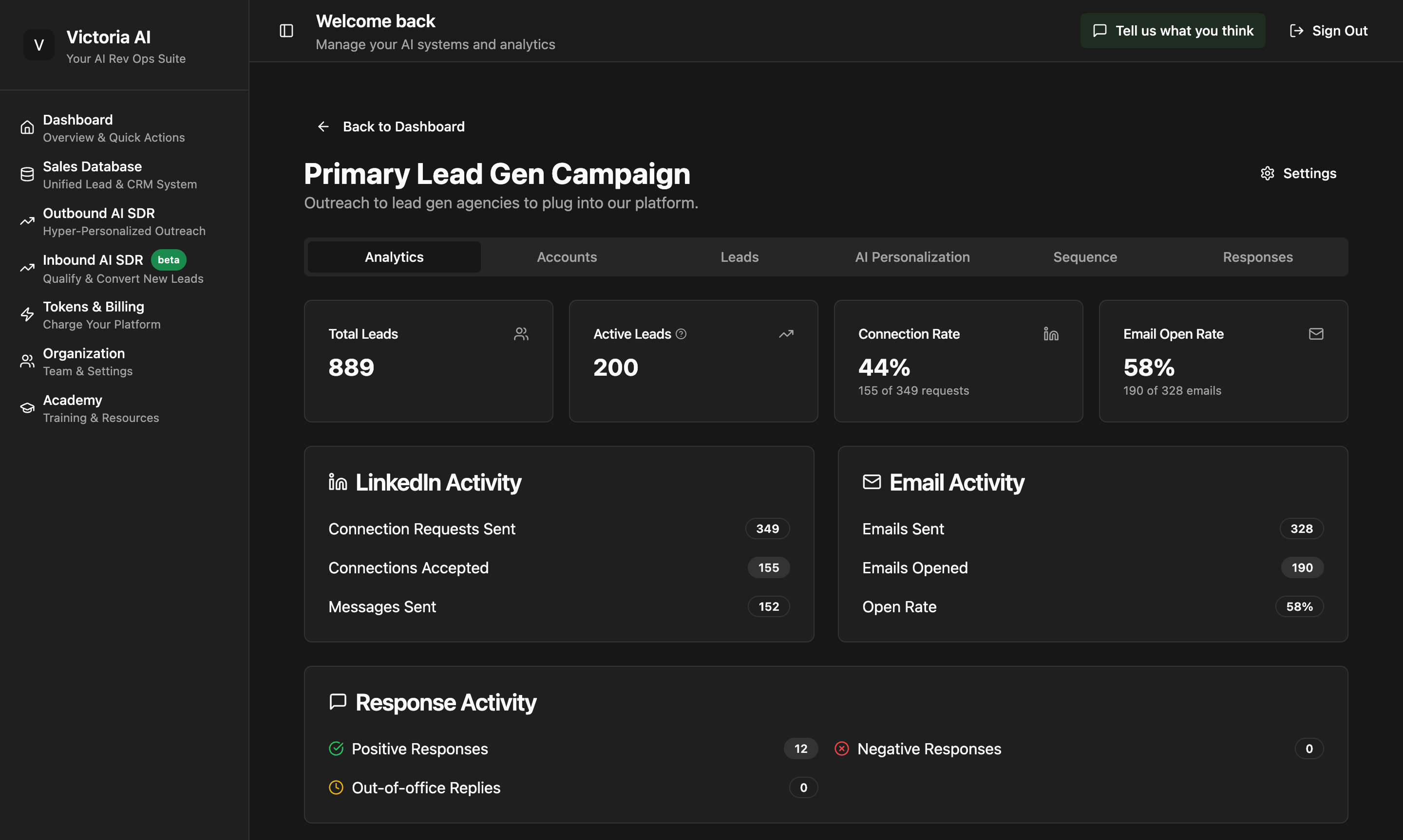 Victoria AI brings together every tool you need—from outbound and inbound SDR, to CRM/database, to content & analytics — so your revenue engine runs as one unified system.