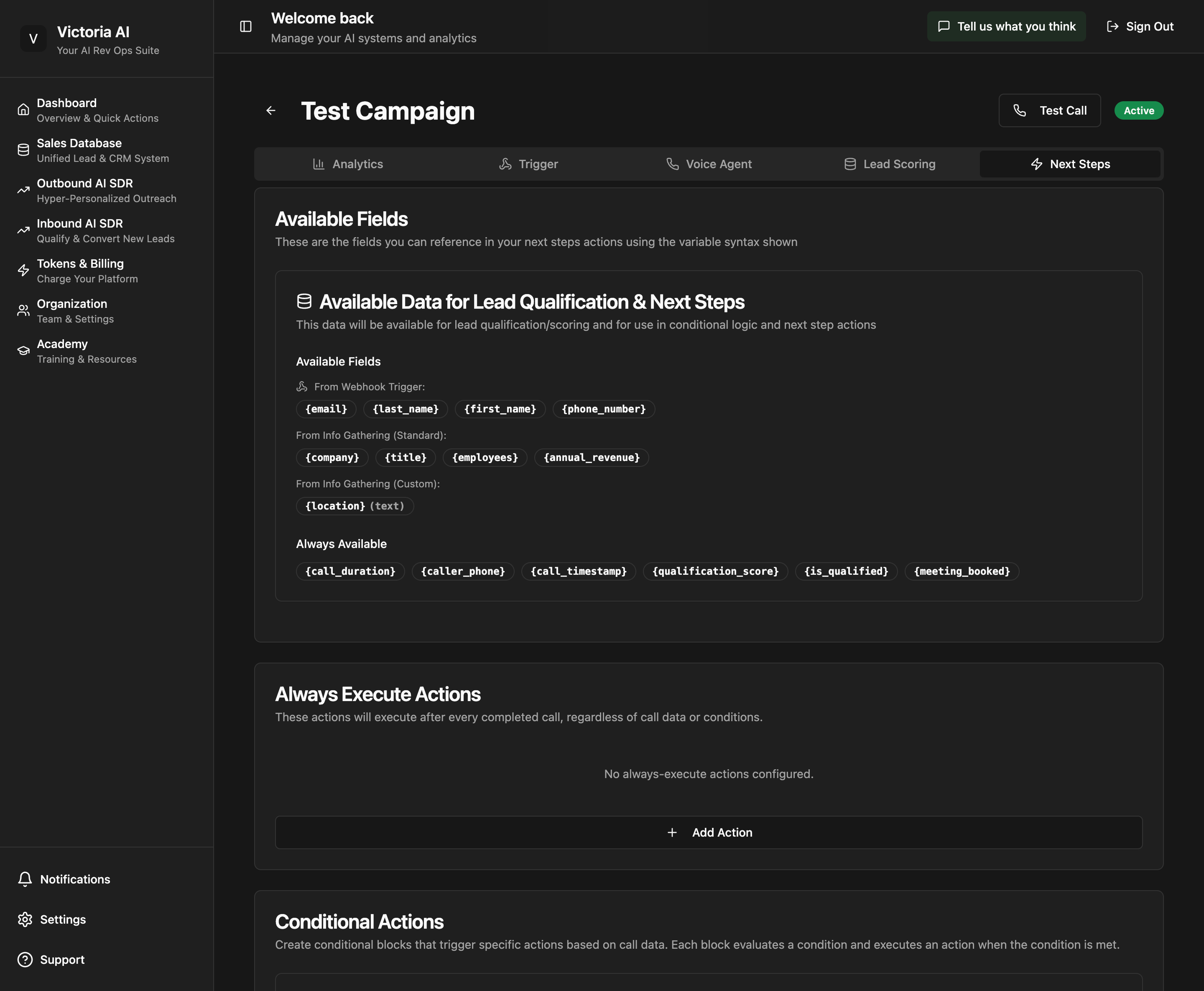 Each campaign lets you enable or disable functions like info gathering, qualification, or meeting booking. You can define exact rules for how and when the agent executes next steps.
